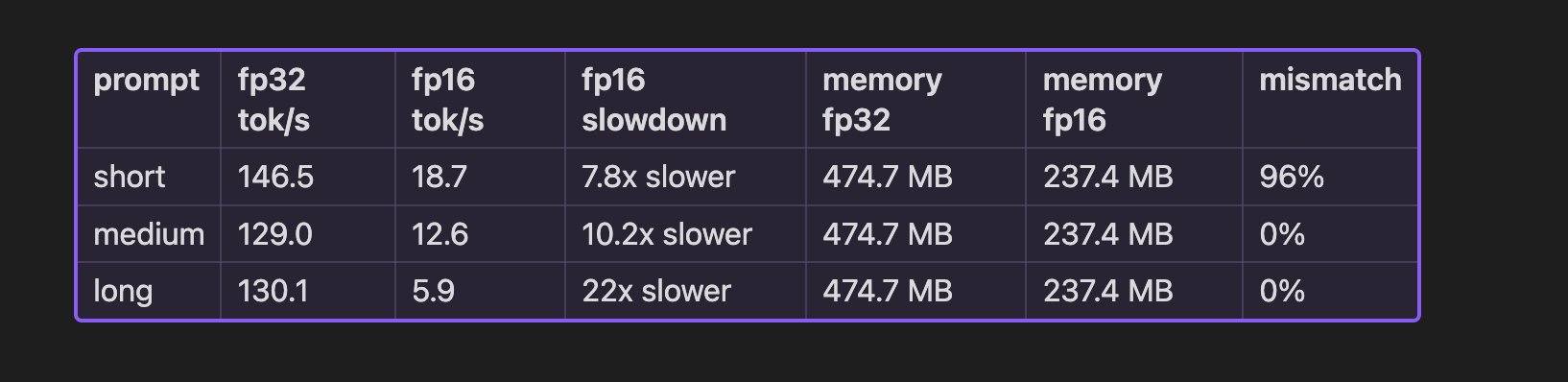 Apple Silicon’s MPS backend doesn’t work that way. fp16 operations often get upcast to fp32 internally to do the actual computation, then downcast back to fp16 to store the result. So you’re paying full fp32 compute cost, plus the overhead of converting back and forth on every operation. The longer the prompt, the more operations, the worse it gets which is why the slowdown goes from 8x on short prompts to 22x on long ones.